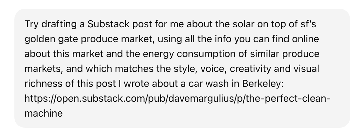 Btw, if you’re freaked out about good this is, don’t be. It clearly isn’t reporting, rather just a verbally decent summary of web data. Actual reporting would involve going to visit the produce market and doing some interviews, and having the context and experience to ask the right questions… stuff that only humans can do (for a long time in the future I hope).