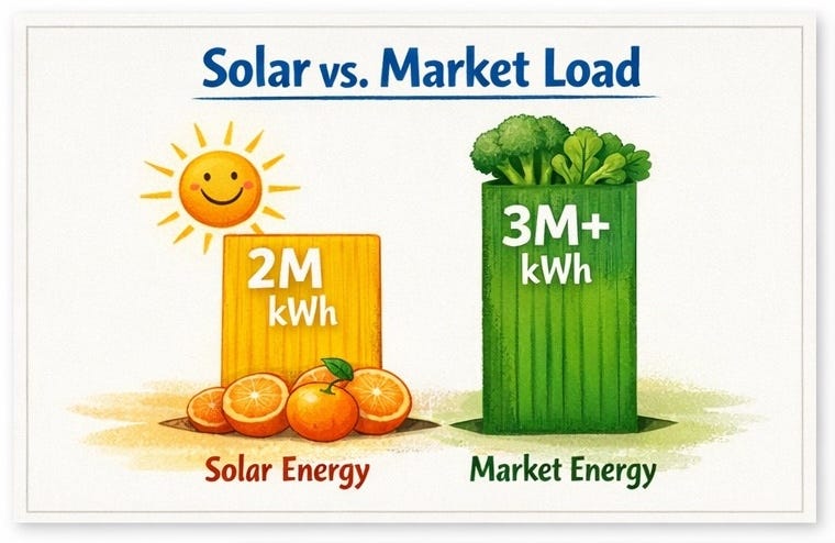 It’s easy to romanticize apples and oranges on the shelf. It’s another thing to stare up at 1,000+ solar panels powering the machines that keep them fresh.